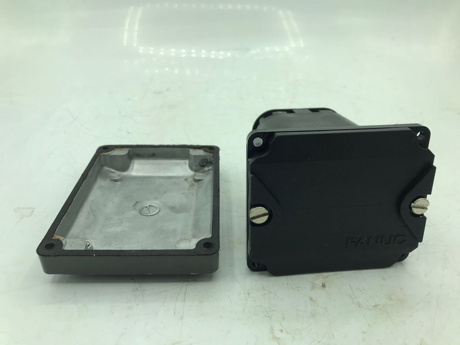 This is a genuine used battery box for the FANUC LR-MATE 200iD robot, compatible with 4C controller configurations (such as R-30iB Mate). This enclosure houses the backup battery pack essential for encoder position retention and system memory when the robot is powered off.