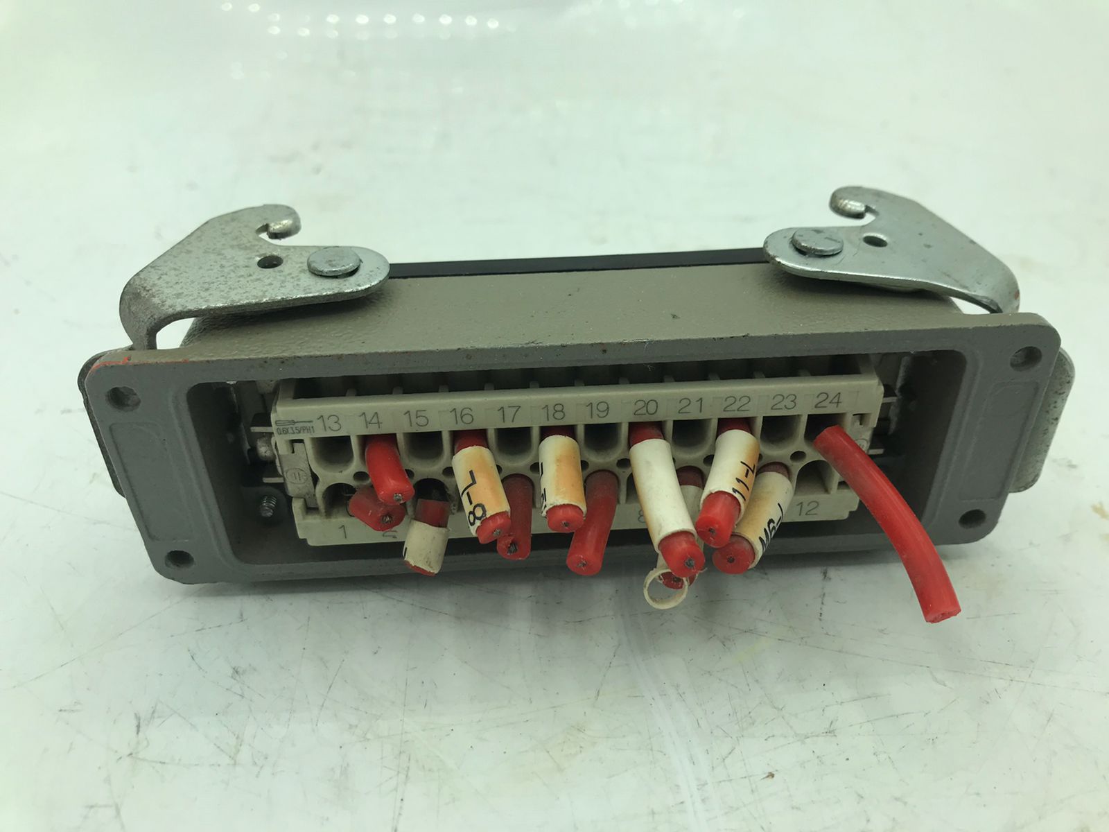 Used HDC-HE-024Y 24-pin female heavy-duty connector insert. Fully tested and in good working condition. Compatible with Harting Han connectors. Ideal for industrial automation and machinery.