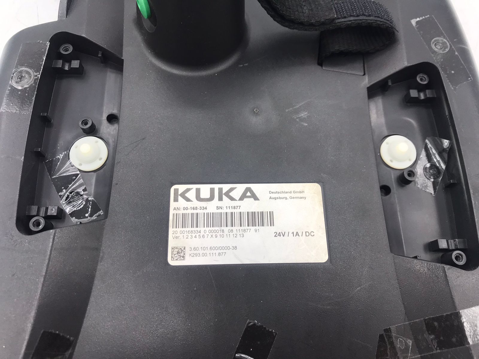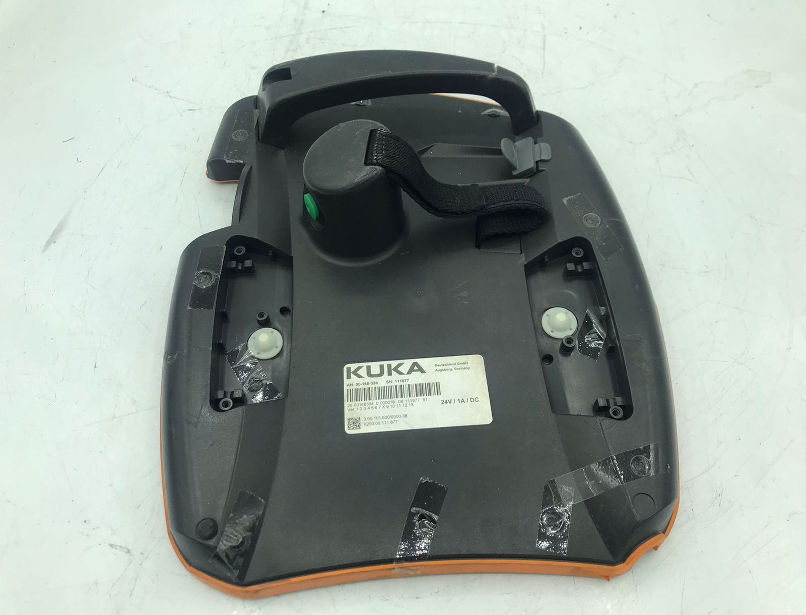🔍 Condition & Quality Assurance: This unit is a genuine KUKA replacement part. The back cover includes the integrated handle, black hand strap, and a ribbon cable for internal component connection. Please note that this unit shows signs of previous industrial use, including adhesive tape residue and scuffs. It is an ideal, cost-effective solution for field technicians needing original structural housing without the cost of a full new assembly.