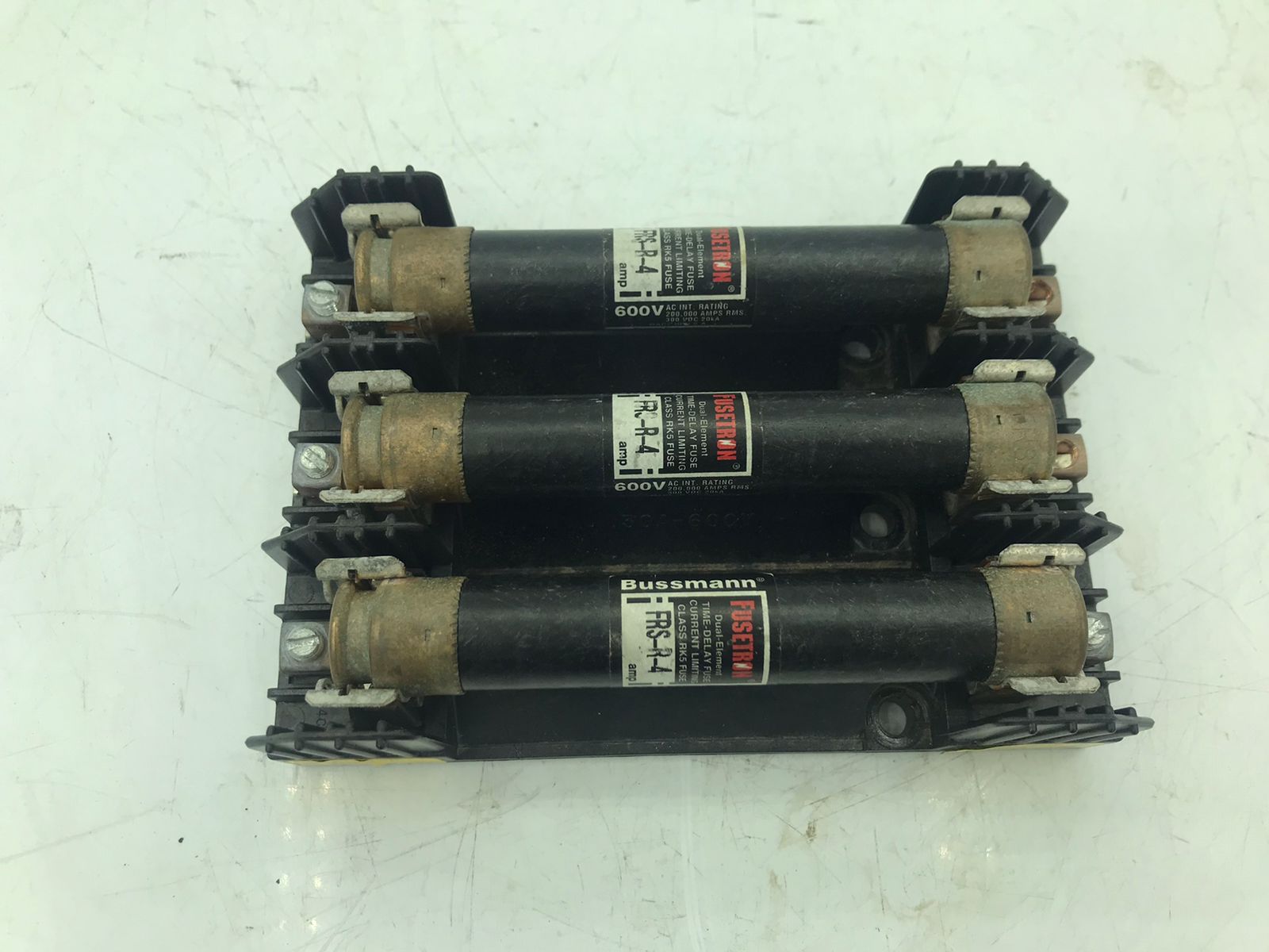 This listing includes one R60030-3COR 3-pole Class R fuse block and one Bussmann FRS-R-4 4A 600V Class RK5 dual-element time-delay fuse.